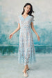 Blue Short Sleeves V-neck A-line Dresses with Sash blend comfort and style. The soft fabric drapes beautifully, while the sash highlights the waist for a flattering fit. Perfect for casual gatherings, outdoor events, or semi-formal occasions.