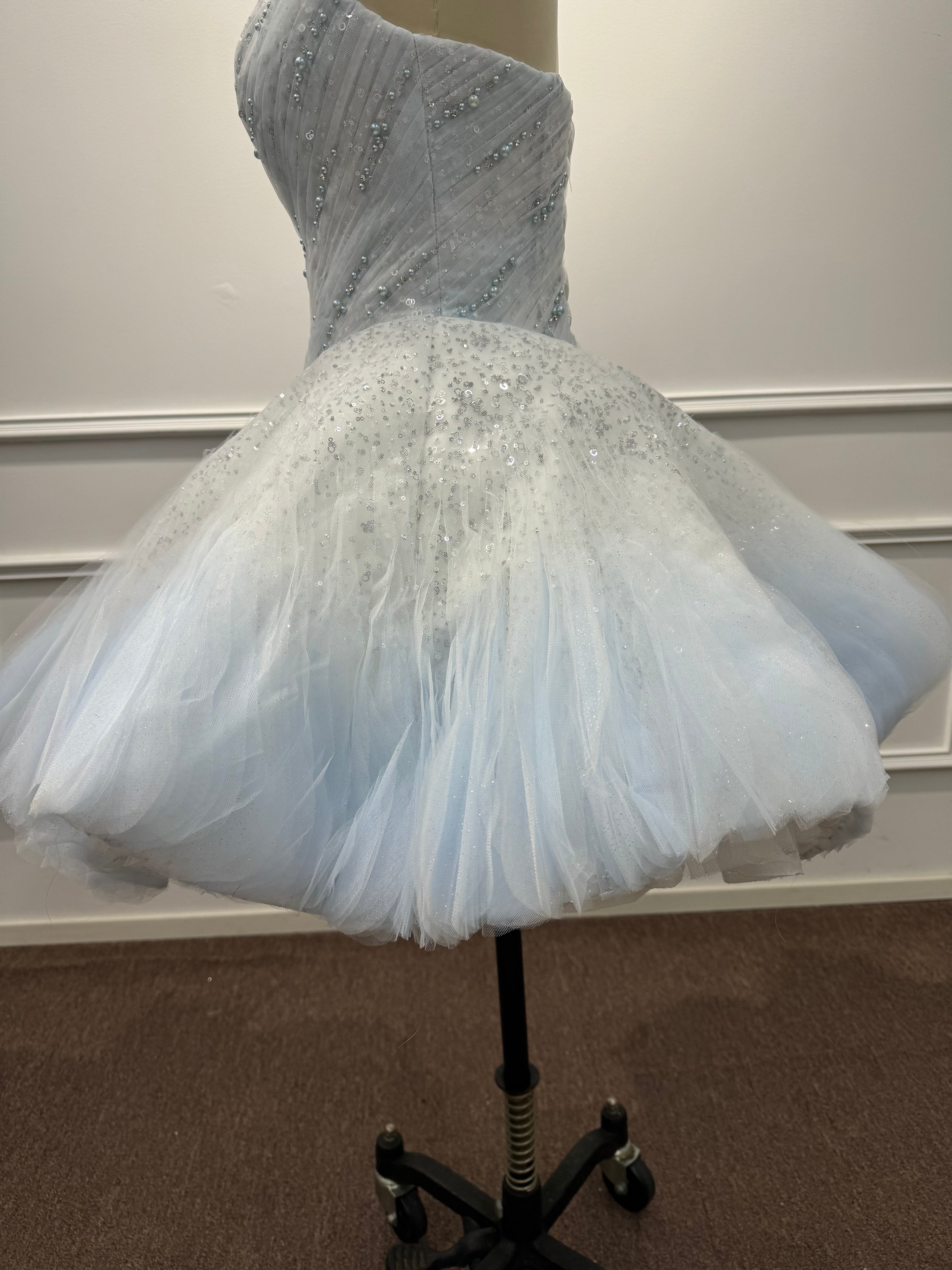 Make a stunning entrance at your next special event in this enchanting blue strapless ball gown. Adorned with exquisite beaded embellishments, this dress combines classic elegance with modern glamour.