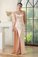 The Champagne Satin V-neck Sheath Long Prom Dress with Slit offers a sleek and sophisticated look with its flattering V-neckline, elegant satin fabric, and high slit for added allure. Perfect for any formal event, this dress combines elegance and bold style.
