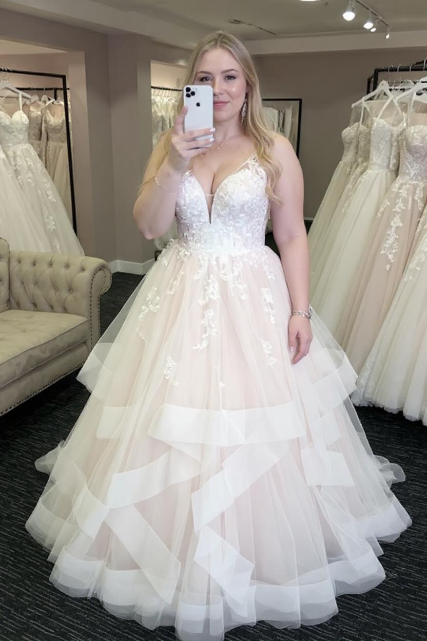 Elevate your wedding day look with our Elegant Long A-line Tulle V-Neck Layered Open Back Dress. Made with tulle fabric and featuring a V-neck and layered open back, this dress exudes sophistication. The A-line silhouette flatters all body types, making you feel confident and beautiful on your special day.