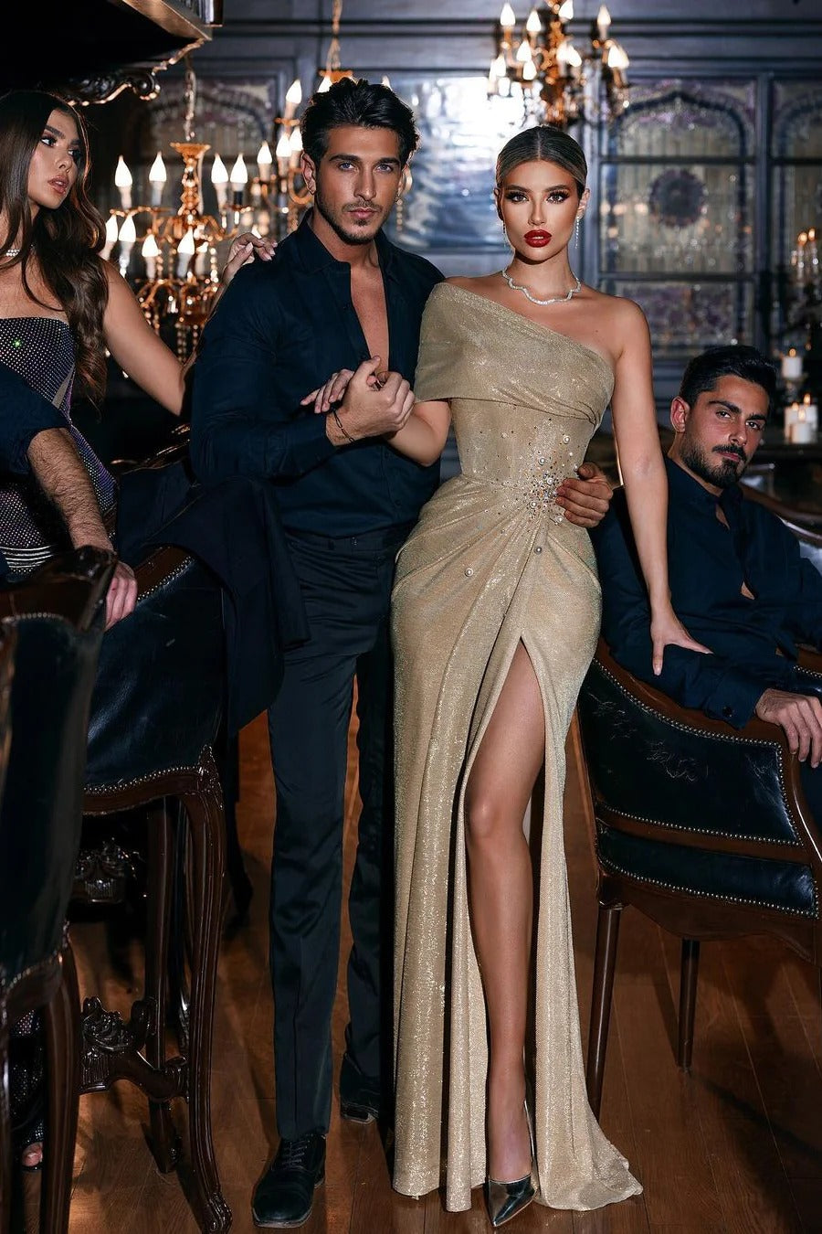 This elegant mermaid prom dress boasts a one-shoulder design and stunning sequined details. Adorned with intricate beading, it also features a high slit for a touch of sultry sophistication. Perfect for any formal occasion, this dress is a must-have for those seeking a glamorous and timeless look.