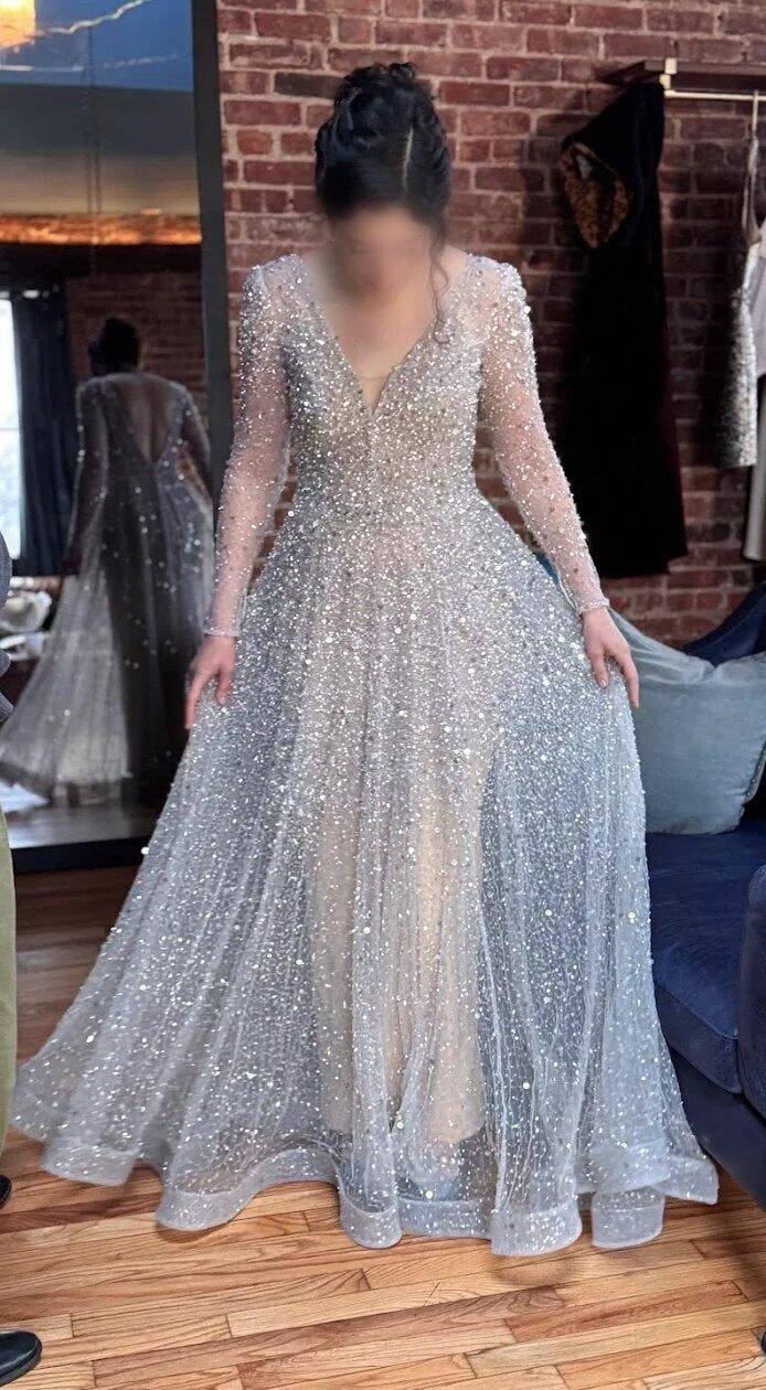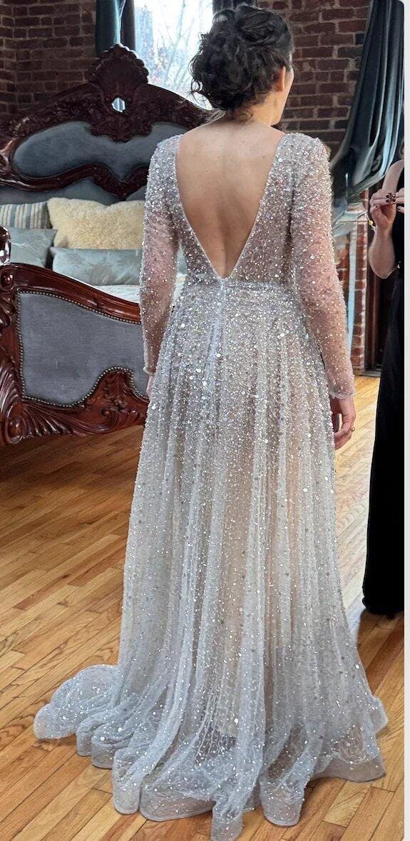 The glitter detail is stunning in person! The V-neck is flattering, and the sweep train gives a dramatic, elegant effect. Felt like a princess all day.