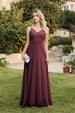 Long V-neck Backless Satin A-line Bridesmaid Dresses features a flattering A-line silhouette that gracefully flows to the floor. The V-neckline adds a touch of elegance, while the backless design enhances its modern appeal, perfect for any bridal party.